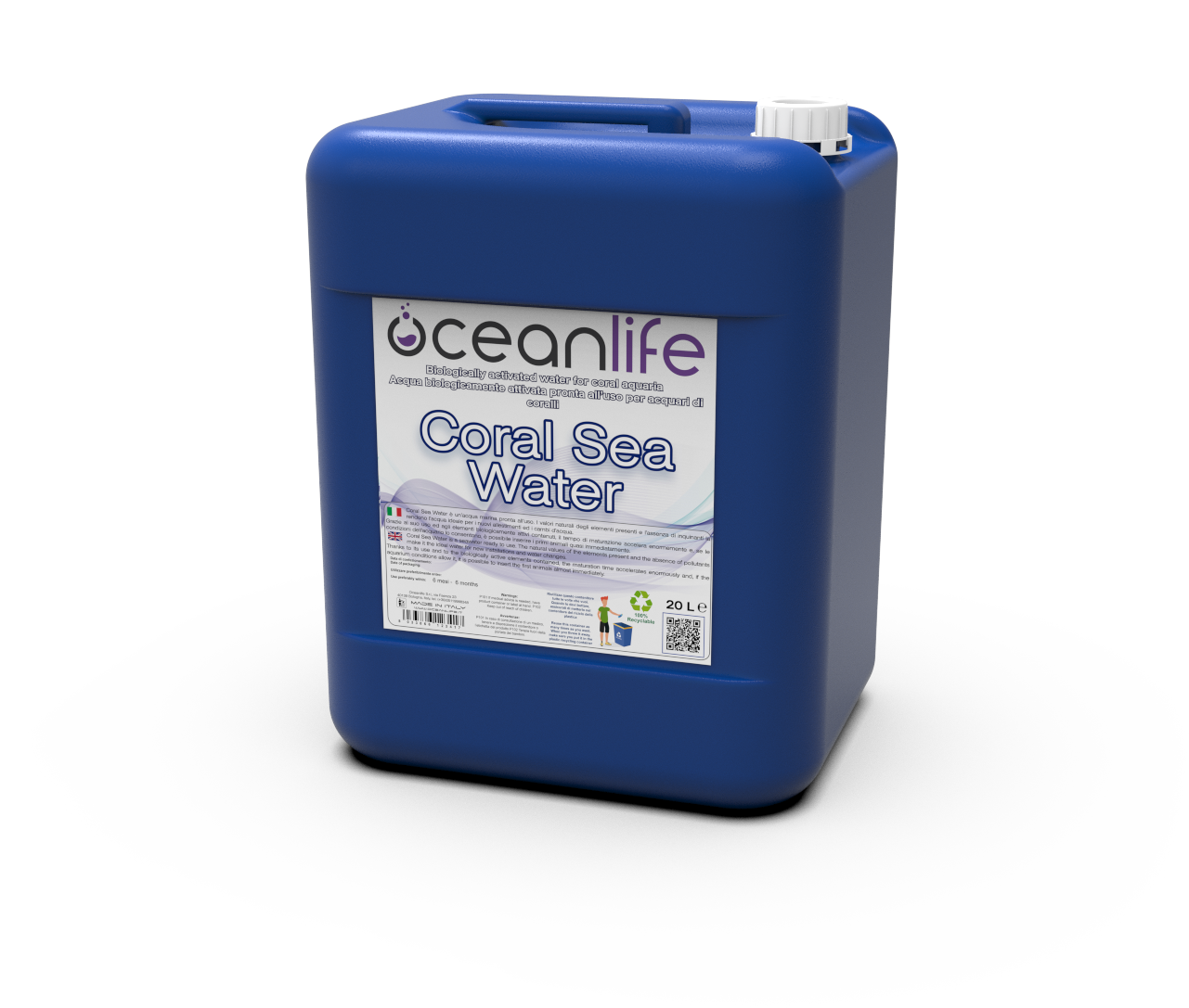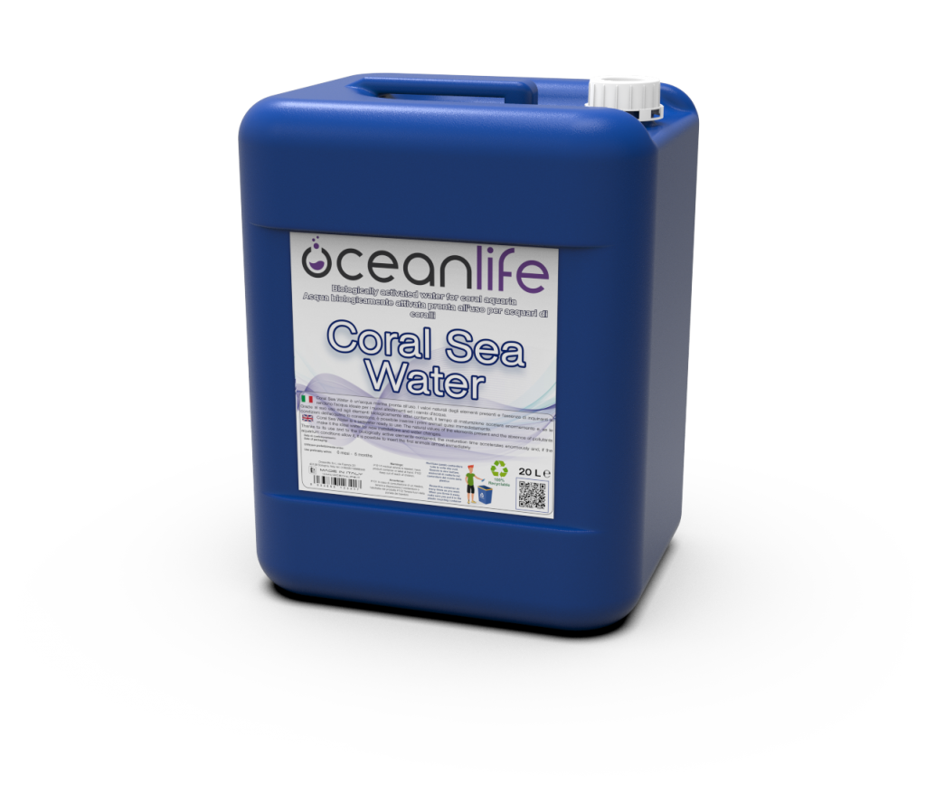 Pour stocker l’eau chez vous, utilisez des bidons en plastique de qualité alimentaire ou bien des cuves en verre collé, il faut absolument la brasser énergiquement en surface et en profondeur, la chauffer à 25 degrés et ne surtout pas dépasser une semaine de stockage. Vous verrez que l’eau de mer naturelle a un effet bénéfique sur les tous animaux de l’aquarium. Faites-le l’hiver car la pollution est moins importante qu’en été.( je ne dis pas ça pour les crèmes solaires !) Il faut reconnaître que cette technique ne concerne que quelques amateurs privilégiés…Pour le reste des récifalistes, le sel synthétique fera parfaitement l’affaire. Ci dessous de l’eau toute prête : coralseawater de Oceanlife (marque italienne)